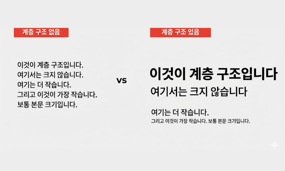 시각적 계층 구조는 단순히 디자인을 예쁘게 만드는 기술이 아닙니다. 고객이 시각적 요소를 어떤 순서로 인식할지를 설계하는 전략입니다. 이것은 디자인의 중요한 부분 중 하나로, 사용자가 화면을 스캔하고 정보를 이해하는 데 도움이 되는 시각적 구조를 만드는 것을 의미합니다.