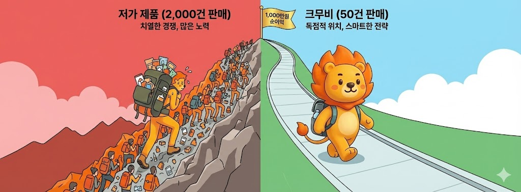 왜 우리는 밤낮없이 주문을 처리하고도, 매출은 그 기대에 미치지 못할까요? 그 해답은 '소싱 전략'에 있습니다. 크무비 소싱은 단순히 비싼 물건을 파는 것이 아니라, 여러분의 시간과 노력을 가장 비싸게 보상받는 전략입니다.