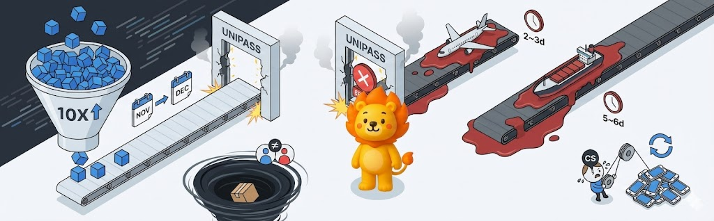 유니패스 접속 지연으로 수입신고 절차가 중단되면서, 평소 하루면 끝나던 항공 통관은 2~3일, 해상 화물은 최대 9일까지 평소보다 3배가량 늘어났습니다.
